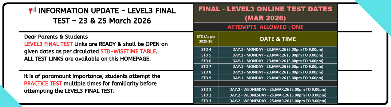 LEVEL3 Final Test for STD 4-5-6-7-8-9 will be on Day.1 -Monday -23.Mar.26. & for STD 1-2-3 will be on Day.2 -Wednesday -25.Mar.26. Pls refer TIME TABLE document & F.A.Q sheet available in the LEVEL3 Ebook Download Links below. Kindly check the TIME TABLE document for further details. |